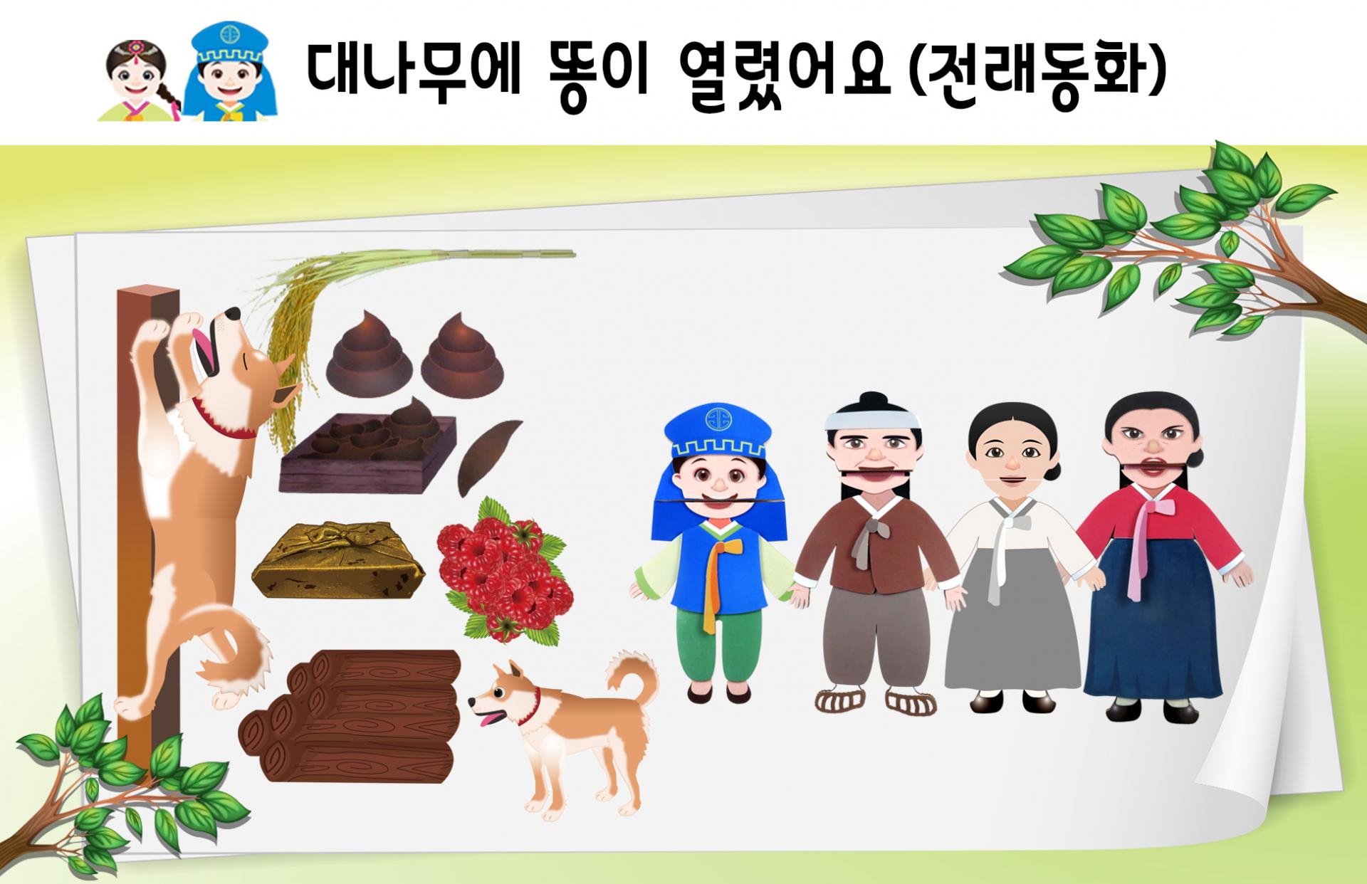 구성: 손인형-4개 소품-도시락, 나무대, 도시락보자기, 산딸기, 나무토막들, 매달린 개, 모형대나무